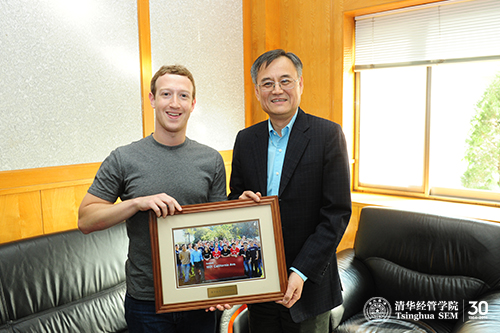 Prior to the Dialogue event with students, Zuckerberg visited Tsinghua SEM and had an in-depth conversation with Dean QIAN. Dean QIAN introduced the history and current development of the School and welcomed Zuckerberg to join the Advisory Board. Zuckerberg expressed his gratitude to be invited to join the Board and hoped to be able to make contributions to the School’s development. Zuckerberg also presented a photo of Tsinghua graduates who are now working at Facebook as a gift to Dean QIAN.