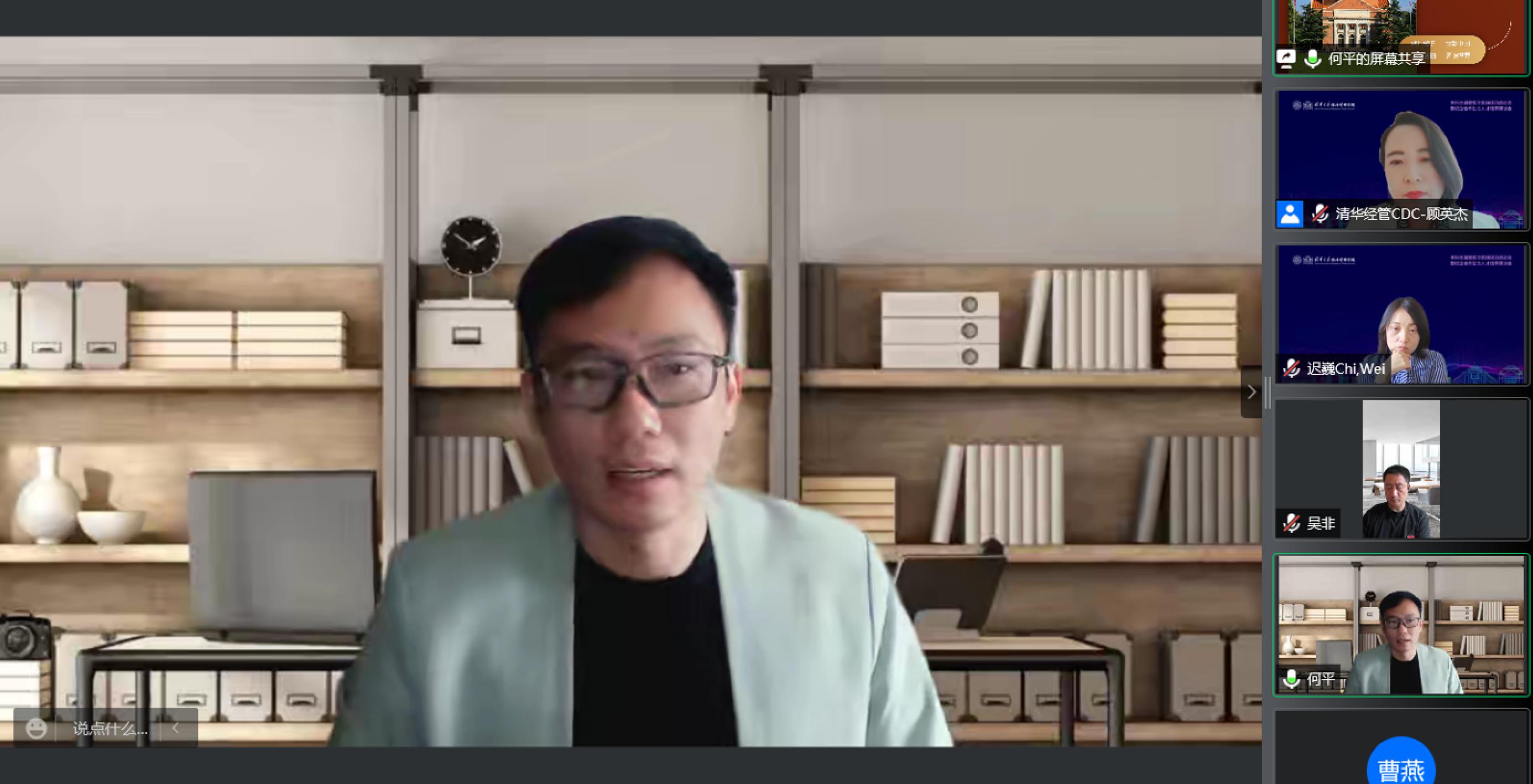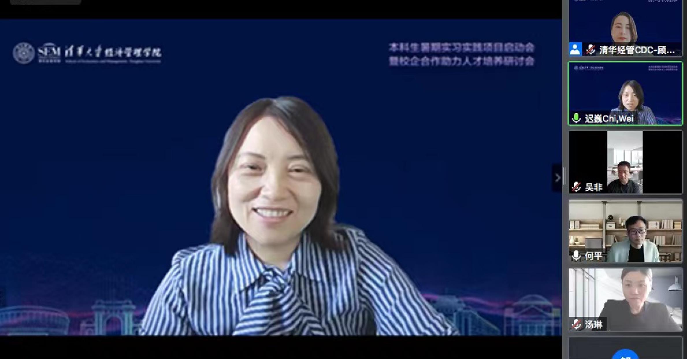 2022年5月23日,清华经管学院本科生暑期实习实践项目启动会暨校企合作助力人才培养研讨会在线上举行。会议旨在校企双方共同探讨人才培养的新思路和人才合作的新模式。通过深度对接企业和行业的发展需求,探索优势互补的协同育人形式,构建校企合作的良性互动,促进学生全面发展。学院党委副书记钟笑寒、赵冬青,副院长何平、薛健,院长助理迟巍、张晨,管理科学与工程系郭迅华教授、金融系沈涛教授、会计系张海燕教授,教学办公室主任张磊、学生工作事务办公室主任郭朝晖等多位老师,以及相关企业高管参加会议。会议由学院职业发展中心主任顾英杰主持。