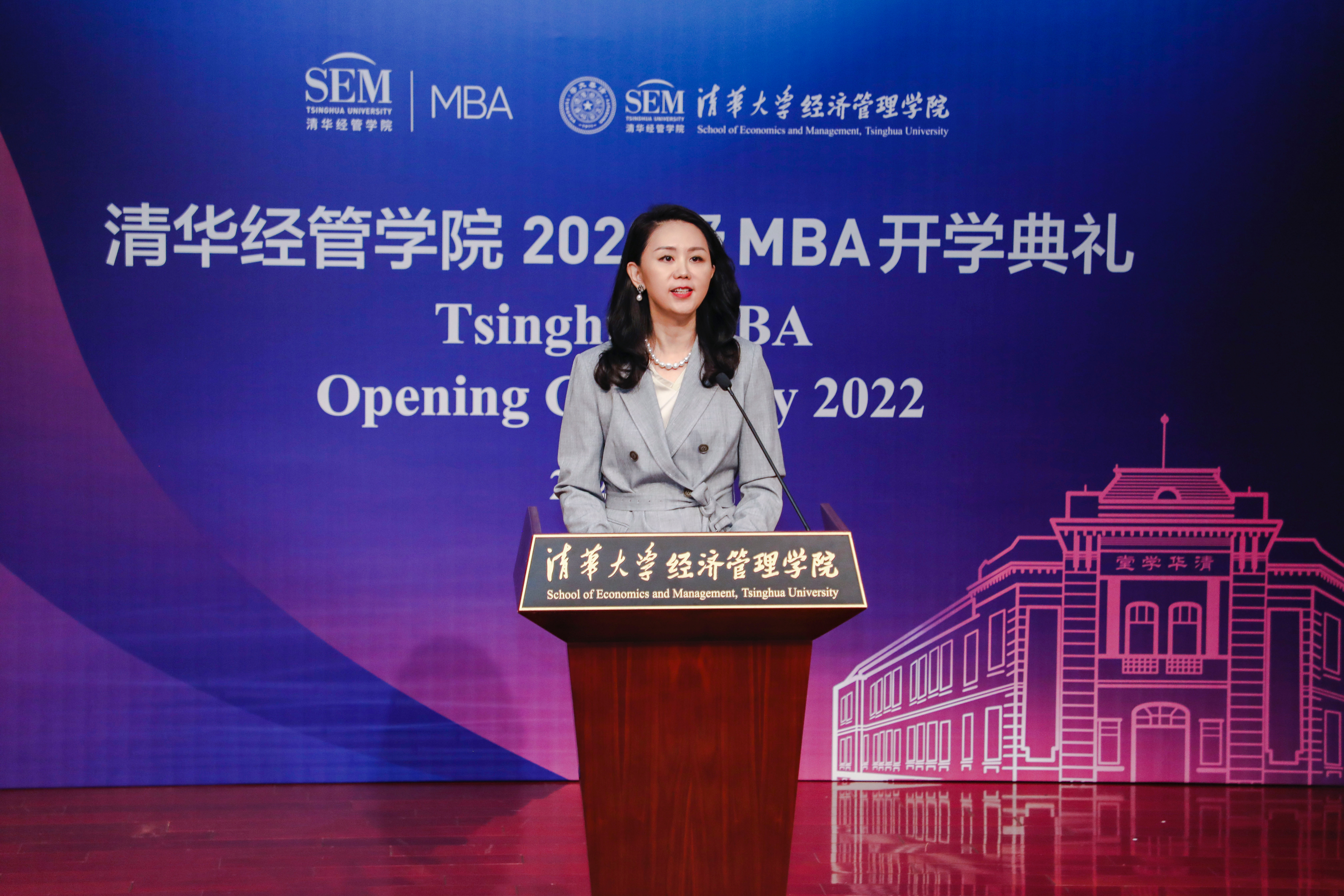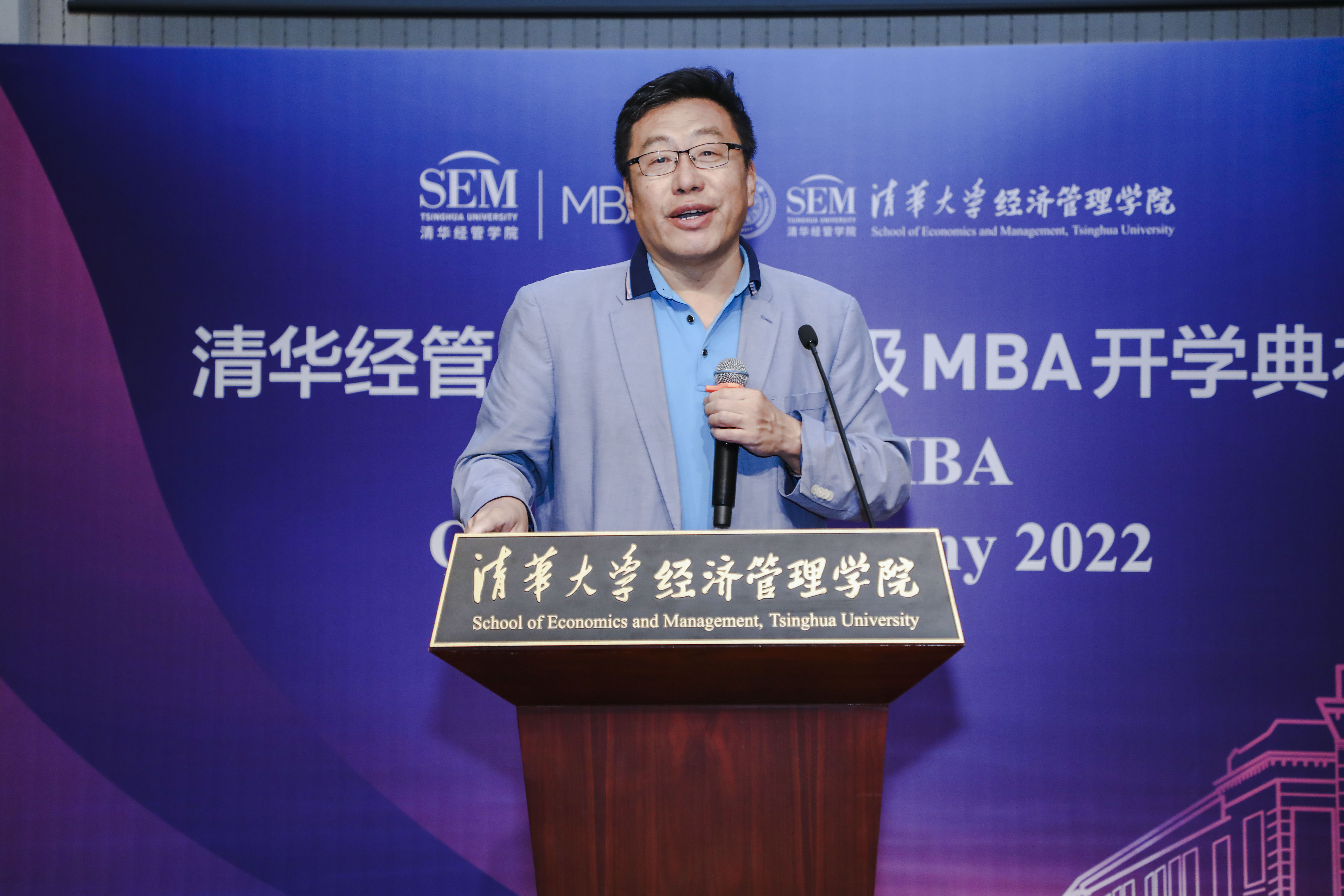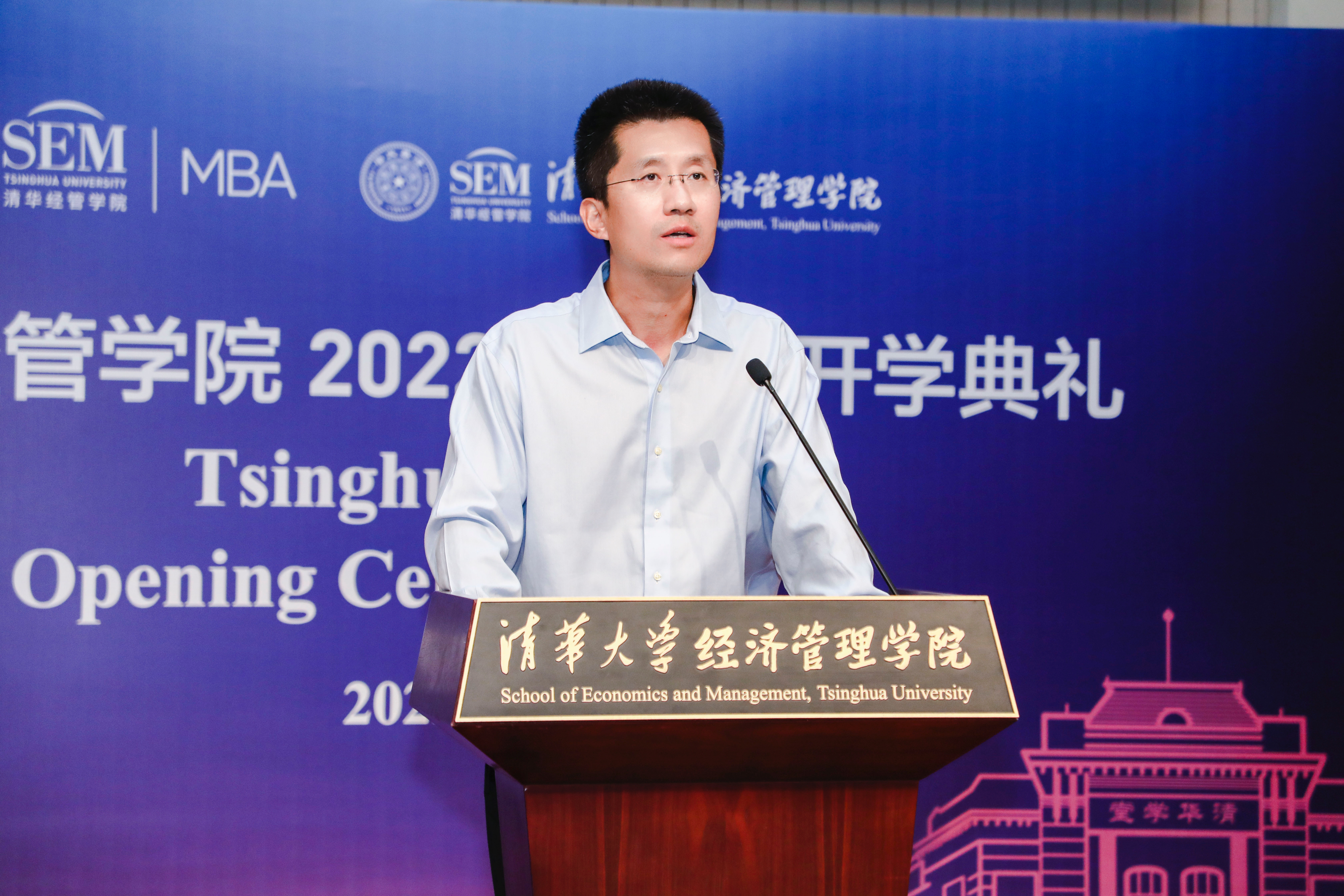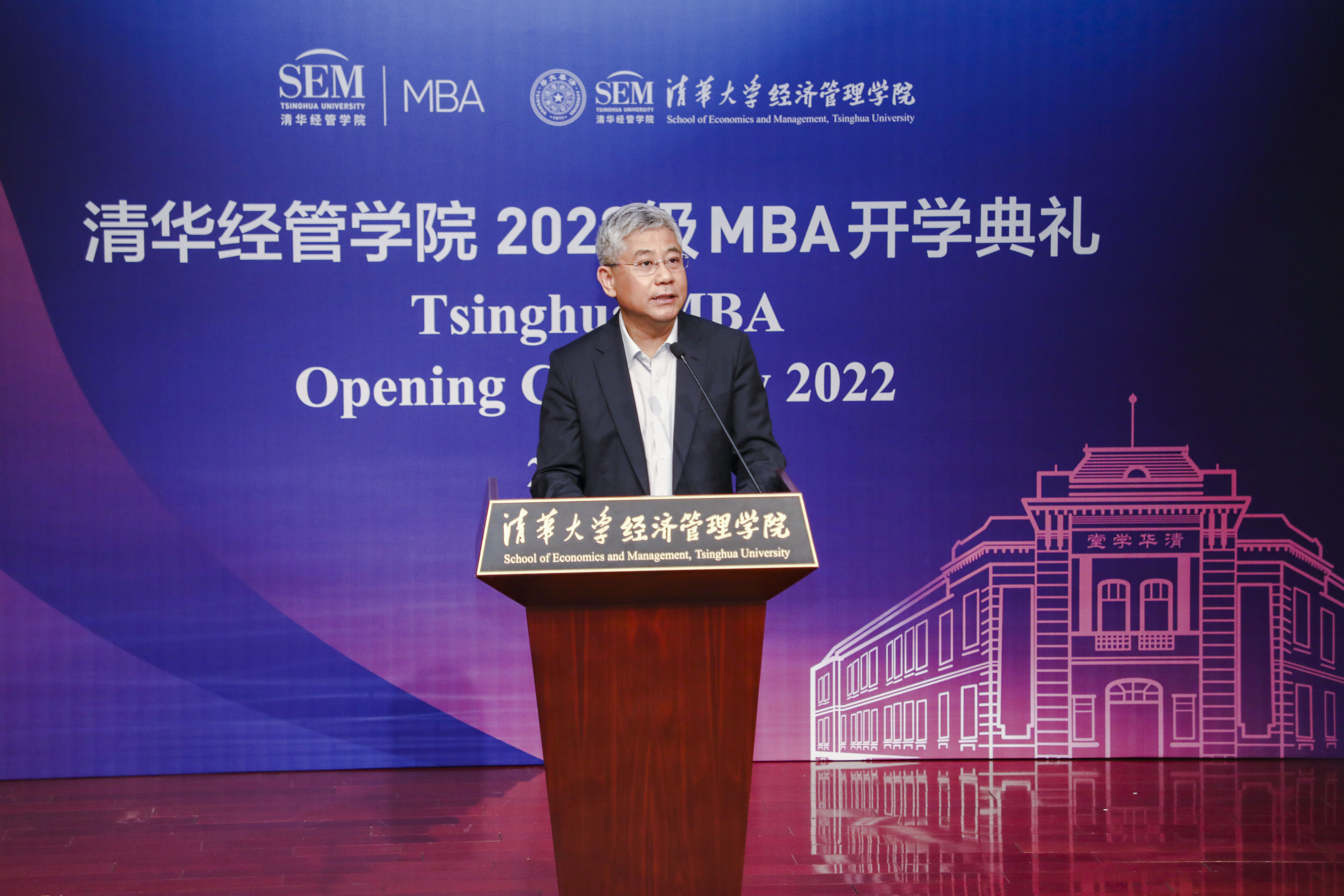 清华经管学院院长白重恩首先代表学院对2022级清华MBA新生加入学院大家庭表示欢迎。他在致辞中谈到,随着“十四五”规划全面展开,我国进入新发展阶段,挑战和机遇并存。在百年未有之大变局中,MBA新生对人生价值应有深入思考,并传承好清华MBA负重致远的精神——经世济民的志向与担当、敢为人先的勇气与坚持。在当今变革创新的组织架构中,每位MBA学生都是创业者、企业家,应密切关注国家“双碳”战略目标,应积极促进中国和全球可持续发展,造福民生,推动社会进步。只有这样,学习目标才会更明确,未来人生舞台才足够广大,人生也才更有意义。他勉励MBA学生要善于学习,将经济管理学科的学习与科技等其他专业知识有机结合,综合考虑行业复杂因素,具备更广博深远的学识,发挥1+1大于2的效果,成为具有领导力的交叉人才。