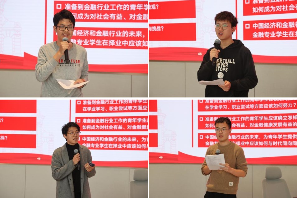 经管学院新生党支部入党积极分子、经2A班侯儒达表示,“金融精英论”只是一种社会幻觉,金融业应更多关注金融业对服务社会、实业的贡献。对于如何成为对社会、金融健康发展有益的金融人才,入党积极分子、经23班尹千舟认为,要将理论知识与中国本土的经济、国情相结合,时刻关注时代变化,守住底线、坚定立场,将个人发展与国家未来紧密结合。