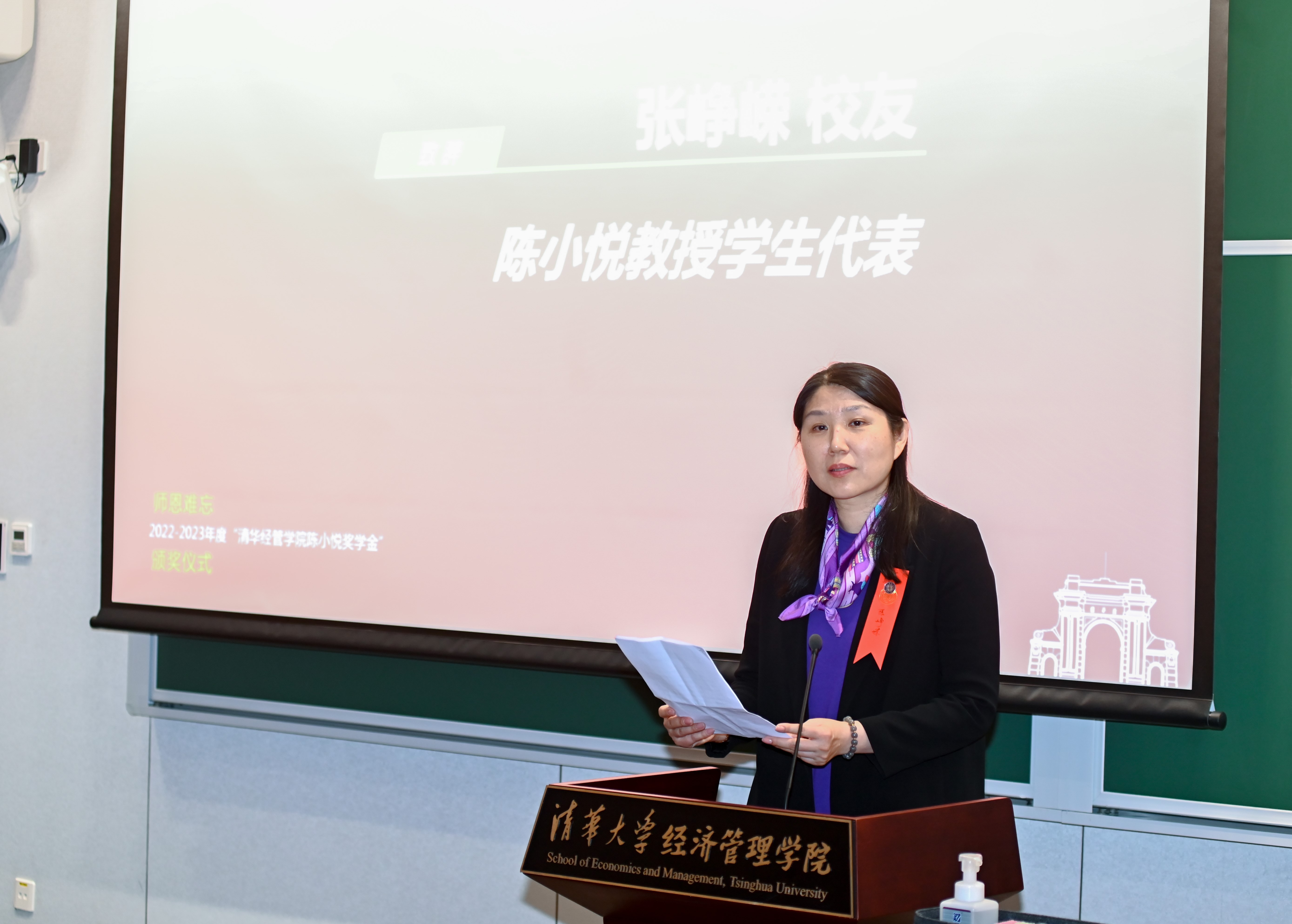 随后,陈小悦教授的学生张峥嵘校友代表发言。她追忆了自己与陈小悦老师的往事,怀念他乐观向上、克己敬业、朴实无华的品格。近年来,奖学金规模日益壮大,作为陈小悦基金委员会的成员,倍感欣慰。张峥嵘希望每一位同学都能传承陈小悦老师自强创新、追求卓越的精神,以青春之我、奋斗之我在未来学习、工作中绽放光芒。