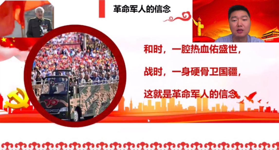 驻央视武警中队党支部用视频短片的方式向大家介绍了中队建设从无到有、从后进到先进的光荣历史。一名班长结合阅兵训练的经历,将同学们的心带入阅兵现场,感受荡气回肠、波澜壮阔的中国军魂。