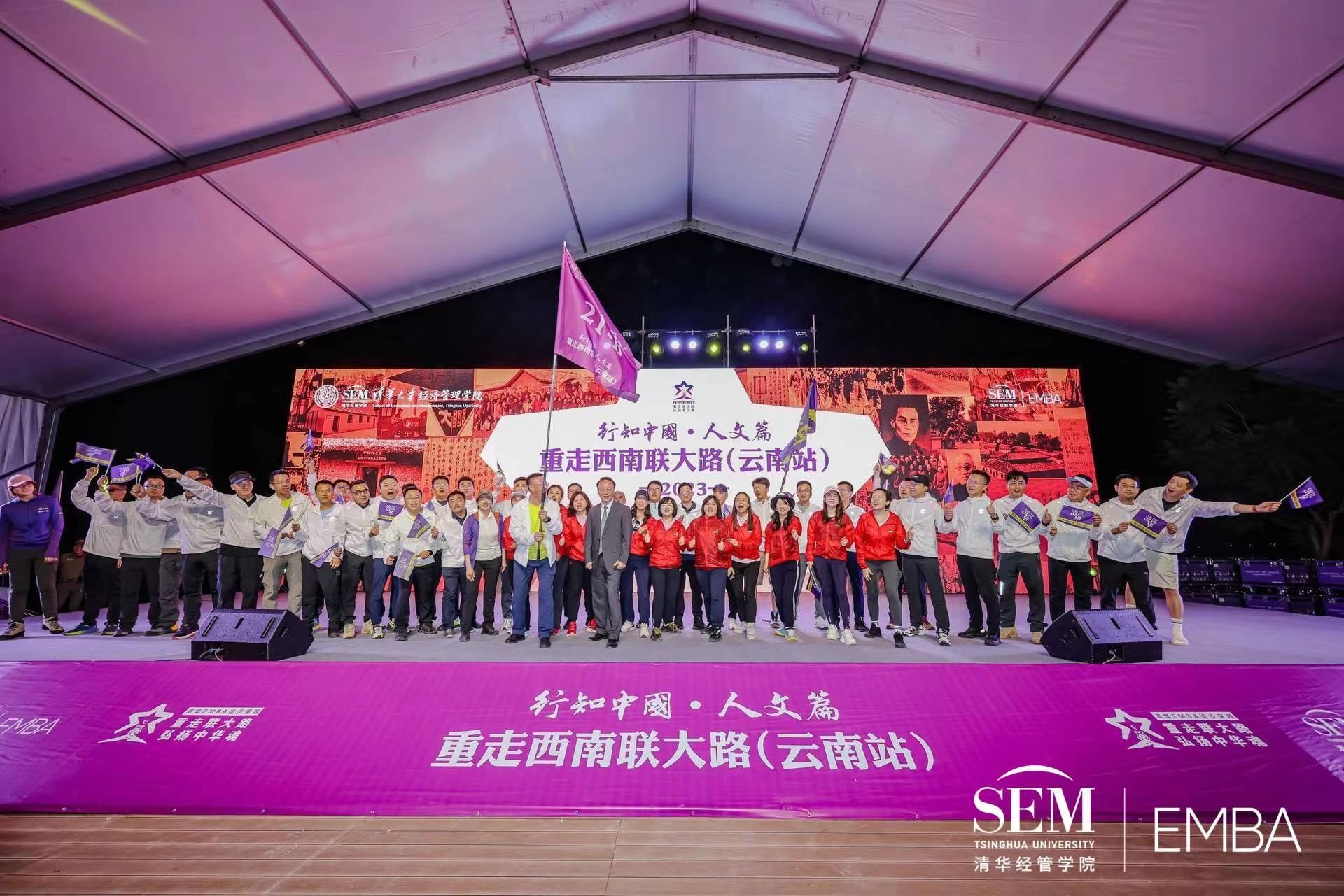 活动尾声,来自国际班、未来科技、21级综合班、22级综合班等共计15个班的代表分别上台接旗。当以清华紫为底色的旗帜在夜空中飞扬,象征着此次“重走西南联大路(云南站)”活动正式起航。对同学们而言,开营仪式不仅是一个新的起点,更是一次激情的点燃与传承。未来三天,清华经管学院EMBA的同学们将用行走来丈量人生,汲取“刚毅坚卓”火种,点燃自己内心的梦想之火,在行走中践行时代担当!
