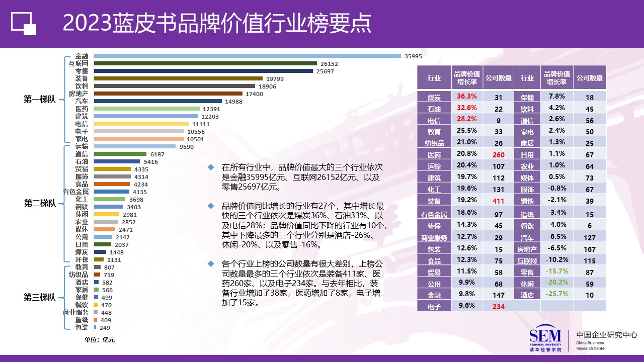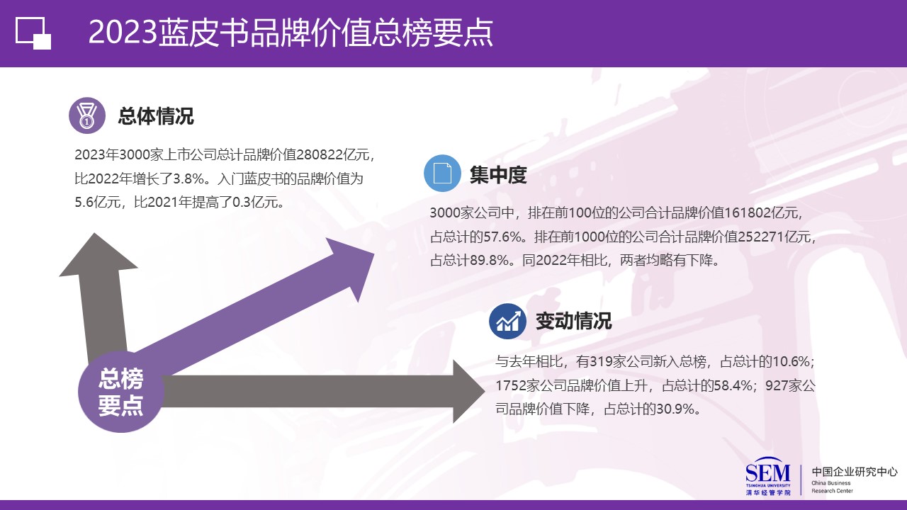 首先,从蓝皮书总体上市公司情况看,品牌价值持续增长。3000家公司的总体品牌价值达到280822亿元,比2022年增长了3.8%。进入蓝皮书的品牌价值门槛也提升到5.6亿元,比2022年提高了0.3亿元。