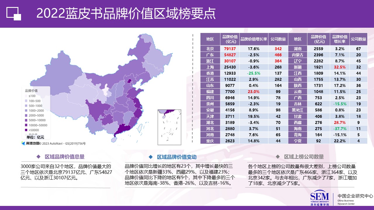 蓝皮书中的3000家公司来自32个省、自治区、直辖市、特别行政区。品牌价值最高的3个地区依次是北京、广东和浙江,品牌价值总量分别为79137亿元、54827亿元和30107亿元。