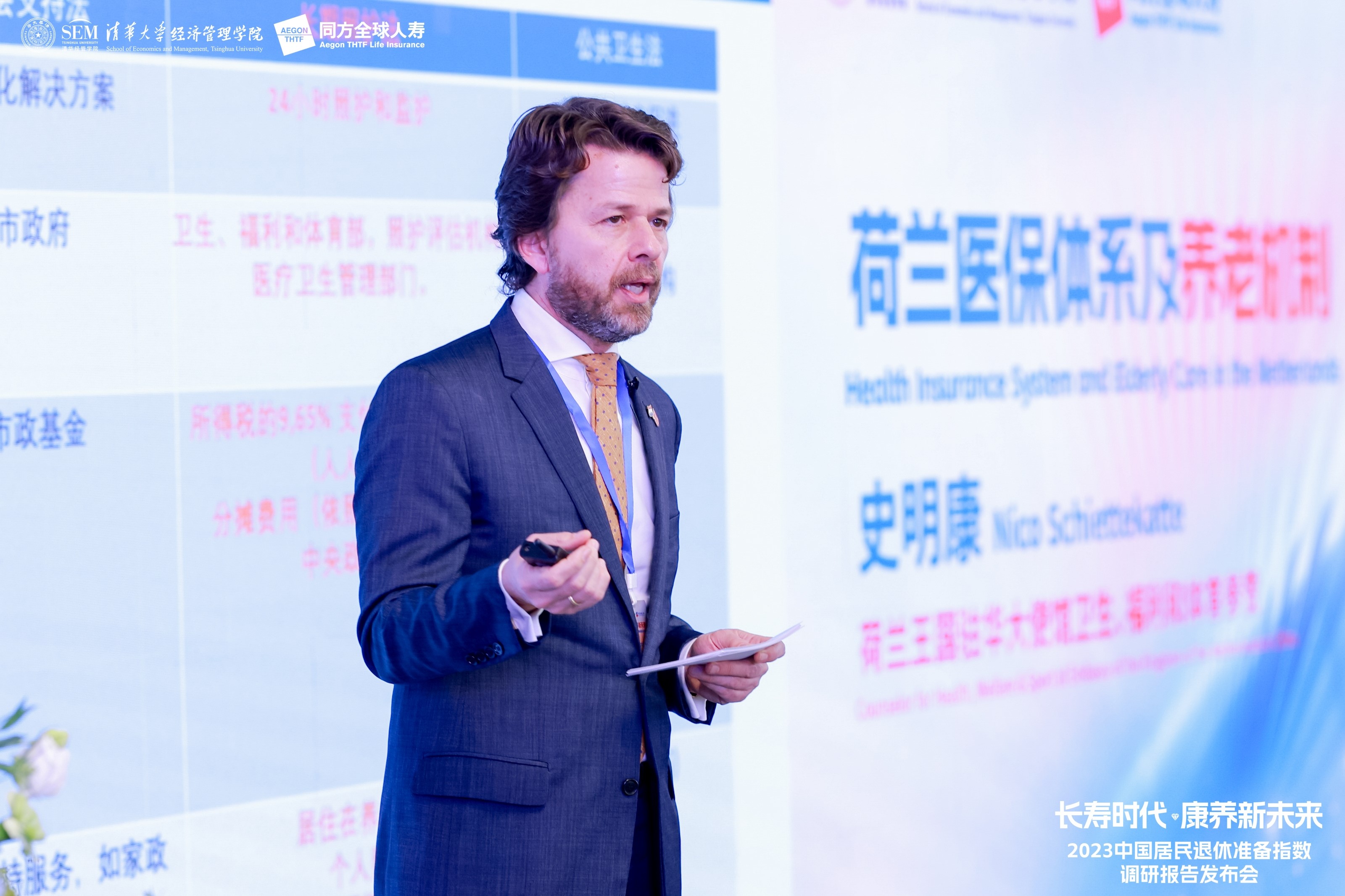 发布会现场主旨演讲环节,史明康首先发表了题为“长寿时代:未来退休面面观”的主旨演讲。在史明康看来,中国与荷兰一样都面临着养老服务业的改革,都共同迎来了一批新一代的老年群体。这些老年群体想要保持对生活的掌控力,让生活更有意义,需要我们寻求变革。他认为,未来应该注重养老护理适应老人实际生活需求;鼓励开展老人自我管理、家庭护理和数字护理;投资居家护理、日常护理和活动中心相关创新项目,通过国际合作不断催生技术创新,提升老人生活质量,优化他们的生活环境,让老年群体更幸福、更健康、更长寿。