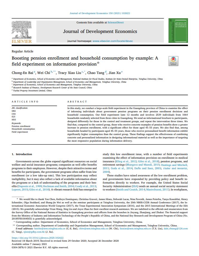 白重恩、迟巍、刘潇等合作成果“Boosting Pension Enrollment and Household Consumption by Example: a Field Experiment on Information Provision(《通过“示例”提高养老保险参与率与居民消费水平:一个信息提供的田野实验》)”(论文)