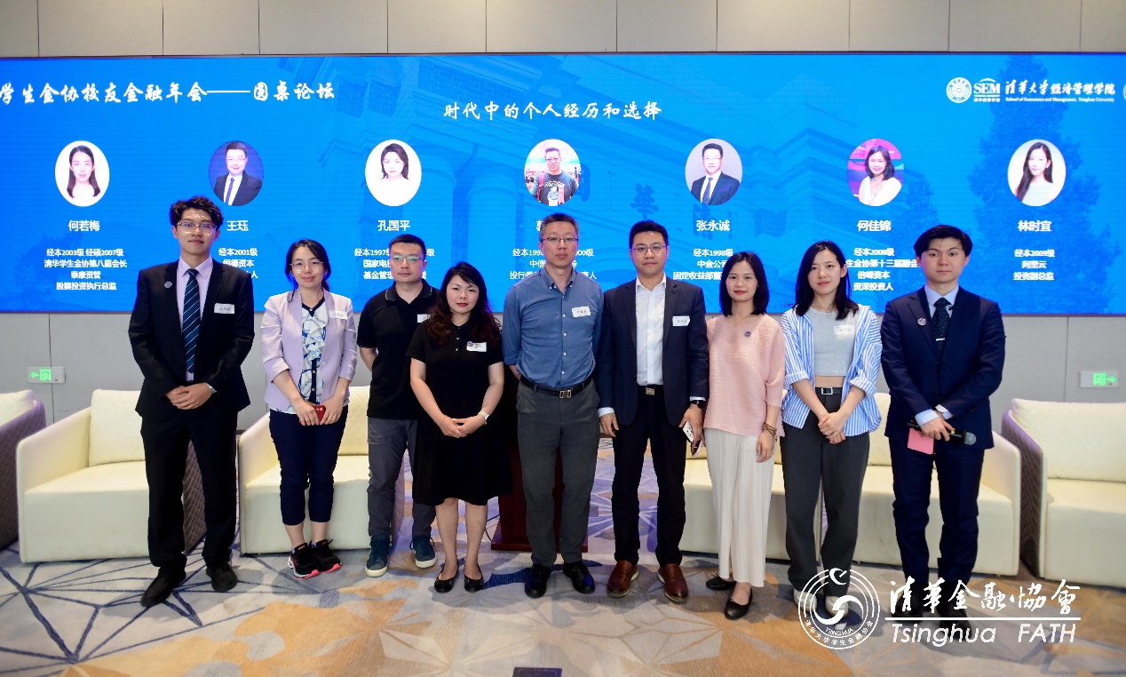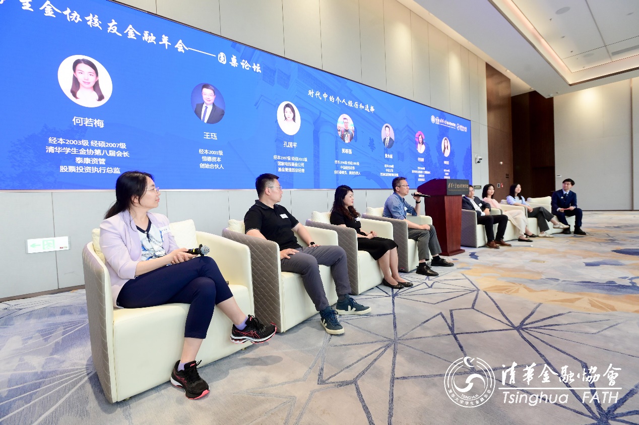 在圆桌论坛环节,中信建投证券投行委委员、质控负责人郭春磊(经1996/经硕2000),国家电投集团创新投资有限公司基金管理部总经理孔国平(经1997/经硕2001),中金公司固定收益部董事总经理张永诚(经1998),恒德资本创始合伙人王珏(经2001),金协第八届会长、泰康资产股票投资执行总监何若梅(经2003/经硕2007),金协第十三届副会长、倍嵘资本资深投资人何佳锦(经2008),阿里云投资副总监林时宜(经2009)围绕“时代中的个人经历和选择”这一主题展开了深入讨论。嘉宾们分享了各自的职业选择和经历,探讨了金融行业中的挑战与机遇,强调了个人兴趣、擅长领域与市场需求相结合的重要性,并鼓励大家在不断变化的时代中找到适合自己的路径。