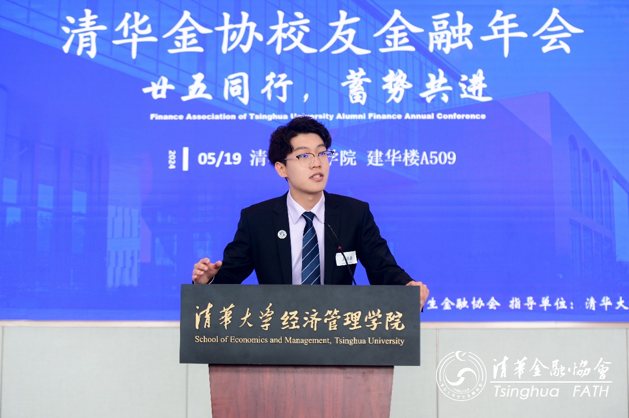清华经管学院党委副书记、金融系副教授高峰(经1995/经博1999)出席年会并致辞。金协第七届会长、Ankaa Capital创始人兼首席投资官王小磊(经2002)作为往届会长代表致辞。金协第二十五届会长、清华经管学院学生会副主席王浩淼(经2020/经硕2024)代表本届金协全体骨干致辞。启迪控股副总裁兼首席财务官赵辉(经1988/经硕1993),国新基金投资二部总经理马绍晶(经1993),大众汽车网络发展与未来营销高级总监田天(经1997)作主题演讲。金协项目部部长尹俊驰(经2021)主持年会。