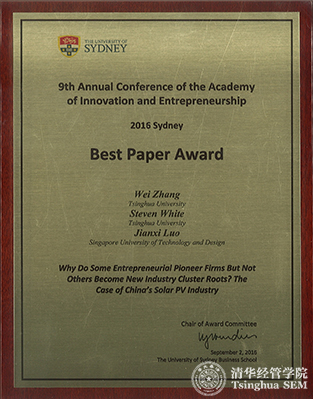 2016年9月,清华经管学院创新创业与战略系张帏教授、白思迪(Steven White)教授与新加坡科技设计大学罗建曦教授合著论文《为什么某个创业企业而不是其它企业能成为产业集群的根基企业?——基于中国光伏产业的研究》(Why do some entrepreneurial pioneer firms but not others become industry cluster roots? The case of China's solar PV industry.)在第九届创新创业国际学术年会(9th Annual Conference of the Academy of Innovation and Entrepreneurship,简称AIE年会)获得唯一的最佳论文奖(Best Paper Award),这是伟德bevictor中文版教师首次在AIE年会上获此殊荣。