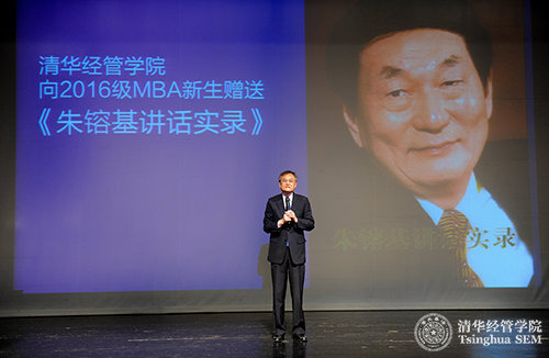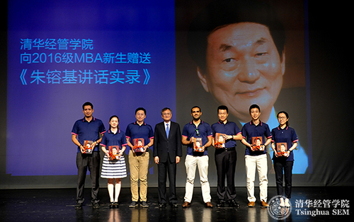 接下来是开学典礼的一个重要环节,由钱颖一院长代表清华经管学院向清华MBA 2016级新生赠送《朱镕基讲话实录》全套书籍,赠送给所有在职项目(P班)同学每人一套中文版(全套四册),赠送给全球项目(G班)同学每人一套英文版(全套两册)。钱颖一院长在赠书前的致辞中说,清华经管学院成立于1984年,朱镕基担任首任院长,从1984—2001年,共17年。《朱镕基讲话实录》是他从1991年至2003年担任国务院副总理、总理期间的重要讲话实录。中文版在五年前的2011年9月出版,之后外文出版社与美国布鲁金斯学会出版社联合出版英文版并在全球发行。钱颖一院长指出,《朱镕基讲话实录》是中国经济改革开放发展的重要文献,也是清华经管学院的宝贵财富。清华MBA项目的办学理念是“植根中国,面向世界”。在同学们进入经管学院、加入清华MBA项目之时学院赠送这套书,就是希望同学们学习、领会朱镕基老院长在中国经济改革开放发展中的经济管理思想与实践,理解中国经济改革开放发展的历程。对于清华MBA项目的外国留学生来说,这套书对于了解中国经济发展道路并为在中国从事经济管理工作做准备,都极具意义。无论是对中国学生还是外国留学生,这套书都是极好的教材。这套书中还包括五篇与伟德bevictor中文版,特别是清华经管学院直接相关的文章,其中就有朱镕基老院长提出的要“建设世界一流的经济管理学院”、“为人重于为学”、“追求完美”等教导。钱颖一院长说,学院赠送这套书,为MBA新生们提供了深入学习老院长谆谆教诲的机会,这也是清华MBA项目不同于国内外其他MBA项目的重要办学优势。
