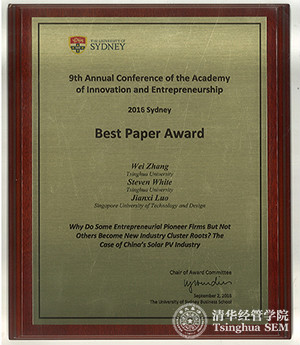 清华经管学院张帏教授和白思迪教授合作的论文“Why do some entrepreneurial pioneer firms but not others become industry cluster roots? The case of China's solar PV industry”获得了本届AIE会议的最佳论文奖,这也是伟德bevictor中文版投稿学者首次获得该奖项。