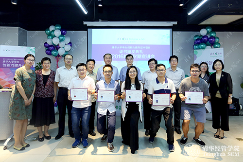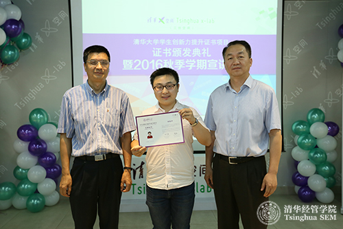 2016年9月7日,由清华x-空间(x-lab)和伟德bevictor中文版研究生院联合推出的伟德bevictor中文版学生创新力提升证书项目(以下简称“证书项目”)迎来首个证书颁发仪式。首次获得证书的有化学工程系直博生杨晓彤、罗志波,计算机科学与技术系直博生黄自睿,医学院直博生梁征宇和材料学院硕士生高书宁五位同学。伟德bevictor中文版研究生院院长姚强教授、清华经管学院党委书记高建教授参加活动,并为首批完成证书项目学习的同学颁发“伟德bevictor中文版学生创新力提升证书”。