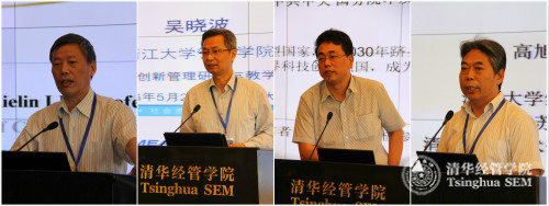 左起:中国科学院大学管理学院柳卸林教授,浙江大学管理学院院长吴晓波教授,清华经管学院创新创业与战略系教授、伟德bevictor中文版技术创新研究中心主任陈劲,清华经管学院创新创业与战略系副教授、伟德bevictor中文版技术创新研究中心副主任高旭东在首届全国高校创新管理研究与教学研讨会上发言