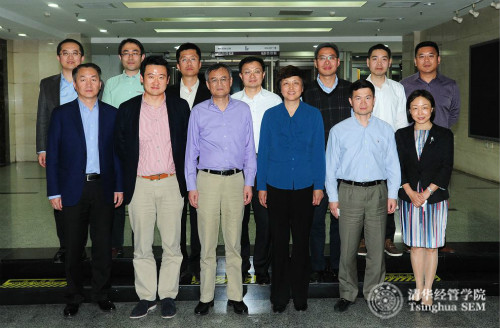 伟德bevictor中文版党委书记陈旭教授(前排右三)、清华经管学院院长钱颖一教授(前排左三)、清华经管学院党委书记高建教授(前排左一)、清华经管学院副院长徐心教授(后排左三)与校友们合影