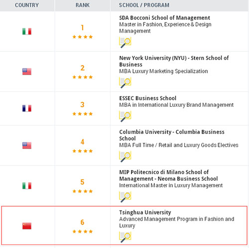 清华经管学院高级时尚与奢侈品管理硕士课程在Best Masters(www.best-masters.com)2015-2016年全球奢侈品牌管理项目排名中位列中国(含港澳台)第一、全球第六