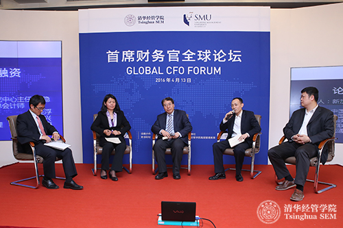 随后进行的是两场高峰对话。第一场论坛的主题是“企业创新投融资”,由新加坡管理大学会计学院院长程强教授主持。中国出口信用保险公司国别风险研究中心王稳主任,中国石油天然气集团公司资金部副总会计师、海峡能源有限公司CFO吕连浮女士,君联资本合伙人、执行董事邵振兴先生以及诚通集团财务有限责任公司副总经理张志海先生是本场论坛的特邀嘉宾。大家讨论的第一个问题是中国企业的创新问题。吕连浮女士认为创新的动力来自于内外部的压力,一个企业没有创新就很难得到投资机会。王稳先生以华为为例指出一个企业要真正将创新落到实处必须重视三个方面:第一是要特别重视研发的投入;第二是重视创新的激励机制;第三,是要形成一个创新的可持续的商业模式。张志海先生从他在不同类型企业的经历和感受来谈企业的创新动力。他认为企业创新跟环境有很大的关系,高科技企业的创新往往具有主动性,因为不创新就会被淘汰;传统的国有企业创新动力在于整个国家经济产业结构调整所带来的外在压力。邵振兴先生认为创新还是要以市场需求为最本质的驱动,任何不以这个为支撑的创新都不是创新。他指出创新一共有三类:管理创新、模式创新和技术创新。创新要实现市场化,必须要进行投资。“国内投资机遇”是本场论坛讨论的第二个话题,邵振兴认为投资的机遇应该从驱动因素着手分析,社会结构的变化、技术革新、经济结构和宏观政策这四类驱动因素下带来了两方面的机会。一方面是消费升级,从商品到服务,从物质到精神;第二方面是智能化,这两方面的机会将会引起国内投资极大的关注。在讨论第三个话题“企业融资”时,张志海强调企业在融资过程中一定要注意三点:第一是量力而行,融资一定要和企业的战略匹配;第二是对国内、国外的政策壁垒要有清醒的认识;第三是团队配合。吕连浮女士认为CFO在企业融资中要承担主要责任,不同阶段的项目,CFO一定要了解金融市场,了解相关投资方的诉求,要知道通过哪些融资渠道去融资,运用股权融资还是债权融资,直接融资还是间接融资。