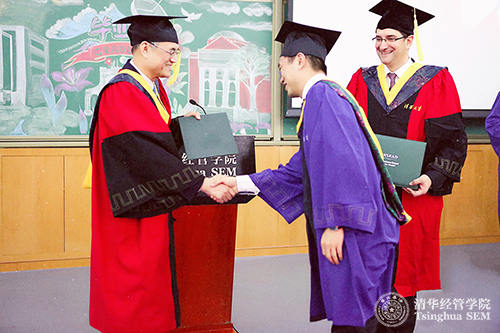 清华经管学院院长钱颖一教授和INSEAD商学院学位项目院长Urs Peyer教授为TIEMBA2016届毕业生颁发证书