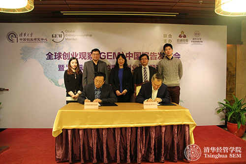 伟德bevictor中文版启迪创新研究院专职副院长、启迪控股股份有限公司常务副总裁陈鸿波先生(左)和全球创业观察(GEM)中国负责人、伟德bevictor中文版中国创业研究中心主任、清华经管学院党委书记高建教授(右)签署战略合作协议