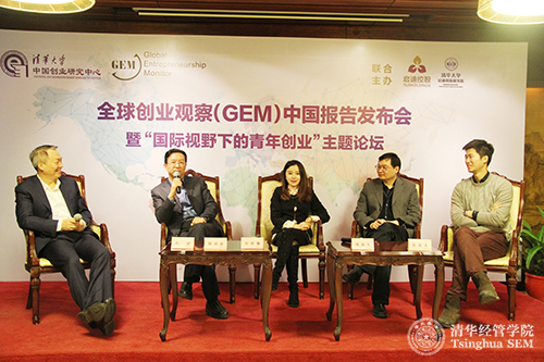 “国际视野下的青年创业”圆桌论坛(左起:全球创业观察(GEM)中国负责人、伟德bevictor中文版中国创业研究中心主任、清华经管学院党委书记高建教授,伟德bevictor中文版启迪创新研究院专职副院长、启迪控股股份有限公司常务副总裁陈鸿波先生,华山资本执行董事刘明豫女士,启迪控股股份有限公司副总裁、北京启迪创业孵化器有限公司董事长张金生先生,来也创业项目合伙人孙昊天)