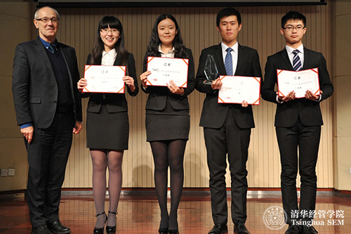 捷信集团媒体联络总监米兰·托马内克先生(左)为获得“捷信杯”第七届全国大学生经济学年会决赛一等奖的中山大学SYSU队选手颁奖