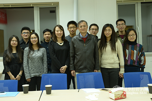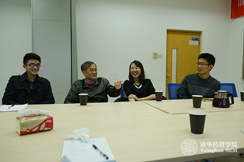 2015年12月24日,“院长下午茶”硕士生专场活动在舜德楼403教室举行。10余名清华经管学院硕士研究生与钱颖一院长欢聚一堂,畅谈理想与生活。