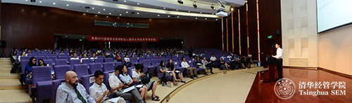 清华经济管理学院副院长徐心教授首先致辞,在致辞中他分享了自己对研究生生涯的感受以及对同学们的期盼。在他看来,研究生生涯最重要的便是“好奇”二字。徐心教授分享了三条与“好奇”相关的感受:第一是“好奇心有多大,有可能做出的成就就有多大”。第二是要培养“好奇”的能力与决心,他说,“大家可以再慢一些,再沉淀一些,再多思考一些。这要求我们有决心,静下心来,沉淀自己去做研究”。第三是要深深体会“好奇”带给自己的满足。“在研究过程中,培养你的能力,展现你的能力,在学术领域得到别人的认可。这能让你得到深层次的满足”。最后,徐心教授预祝在座的同学都能成为一个幸福的研究生。