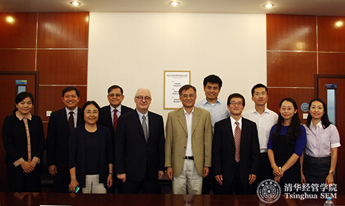 前排左起:清华经管学院副院长钱小军教授、新加坡管理大学校长迪枚晔(Arnoud DeMeyer)、清华经管学院院长钱颖一教授、新加坡管理大学会计学院院长程强教授、清华经管学院会计系系主任肖星教授、清华经管学院硕士项目办公室执行主任张亦萌老师