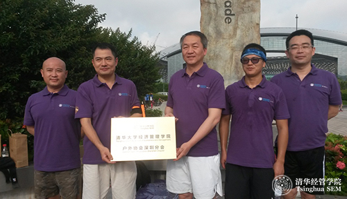 清华经管学院党委书记、副院长高建教授(右三)向清华经管学院户外协会深圳分会会长汪姜维(经1995)(左二)、秘书长高贵中(经2001)(右二)授牌