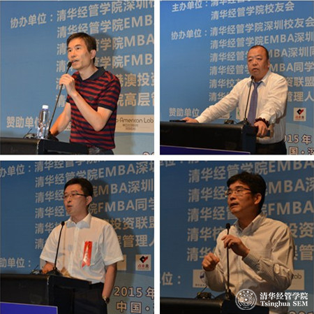 朱岩教授的演讲后,参会校友分别从不同行业、不同角度就“互联网+”思想在本行业内的应用进行了提问,朱岩教授就提问给出了精彩的回答、与校友们进行了热烈的互动。接着,张志航(经2005)、郑学州(MBA1997)、单新宁(经2005)三位校友代表进行分享汇报,他们叙述了自己在清华经管学院的求学经历,回顾了在求学期间的师生情谊。张志航校友分享了学院教导的经济学素养如何帮助自己在生活中做出决策,郑学州校友分享了自己的创业经历和清华经管学院创业联盟的进展,单新宁校友则分享了在校时钱颖一院长给自己未来人生的启示和指引。