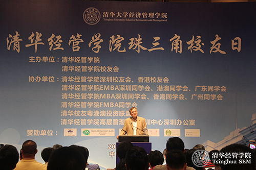 2015年5月31日下午,“清华经管学院校友日:2015年•珠三角”活动在深圳举行。清华经管学院院长钱颖一教授,党委副书记朱岩教授,校友办公室主任王海涛(MBA2012-金融)参加了活动。清华经管学院深圳校友会会长李华辉(经1980),伟德bevictor中文版EMBA深圳同学会会长潘军(EMBA2006),清华经管学院MBA深圳校友会副会长孙学东(MBA1996),伟德bevictor中文版-香港中文大学金融财务MBA同学会副会长郝福寨(MBA2007-金融)以及清华经管学院珠三角地区校友和各界人士400余人参加活动。活动由汪姜维(经1995)主持。