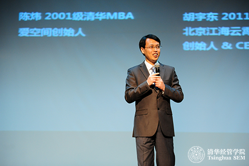 随后,两位清华MBA创业校友分享了自身的创业经历与感悟。2001级清华MBA校友、爱空间科技(北京)有限公司创始人、首席执行官陈炜以“爱空间、爱颠覆”为题,介绍了自身第四个创业项目“爱空间”的成功创业经历。他说,好的产品是演化出来的,而不是规划出来的。打造家装爆品需经历“标准、极致和参与”三步曲,而根本上在于一个“爱”字。创业成功的逻辑很简单——“唯有爱,能改变”!