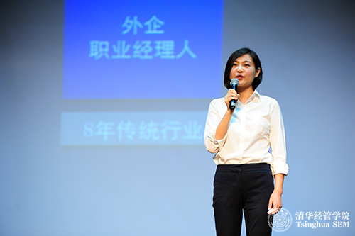 2013级清华MBA全球项目林开,以自己8年职业道路上面对商业痛点的迷茫作为切入点,谈到入读清华MBA后的一次麦肯锡课程,彻底颠覆了自己原有的商业价值观,深刻认识到互联网行业面临的重大商业模式的变革,并在实习实践中深刻体验这种变革所带来的颠覆性影响,从此确定了自身职业生涯的转型方向。她还介绍了在波士顿的百森商学院(Babson College)海外交换学习期间,自己成功拓展泰餐O2O商业模式的故事。她表示,经过两年学习,自己已经懂得如何面对事业生活中的迷茫、挣扎与困惑,这是入读清华MBA的最大收获与价值。