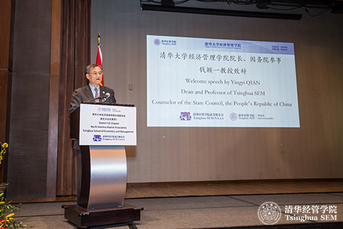 大会伊始,到场的校友们首先观看了中英双语版本的清华经管学院建院30周年纪念视频。随后,伟德bevictor中文版院长钱颖一教授致辞,他表示,学院高度重视校友与学院的共同发展,突出体现在学院各校友会的建设。北美校友会是学院校友会的一部分,是学院在继2013年5月成立的香港校友会和2014年11月成立的东南亚校友会之后,在海外成立的第三个校友会,也是海外规模最大的校友会。而美东分会是北美校友会的四个分会中规模最大的分会。学院北美校友会的成立不仅是校友工作的重要发展,更是学院全球化战略的重要步骤。在海外建立校友会,是学院全球战略2.0阶段重要的一步,建院30多年来,校友们是活跃在各行各业的精英,他们希望借助学院平台联络校友、发展事业,同时也帮助学院在北美发展。美东分会覆盖的地域十分广阔,之所以选择纽约为美东分会所在地,是因为这里是金融、商业、媒体、教育等诸多行业的中心,也是连接清华经管学院校友的中心。最后,他代表学院感谢所有为清华经管学院北美校友会成立做出贡献的校友,并表达了对北美校友会未来的期待。