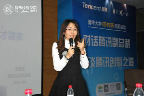 2015年4月16日晚,应清华x-lab(清华x-空间——伟德bevictor中文版创意创新创业教育平台)之邀,腾讯公司副总裁兼技术委员会主任王巨宏女士做客伟德bevictor中文版第二届“校长杯”创新挑战赛高峰论坛,作“互联网+时代,腾讯创新实践与人才需求”主题演讲,并与清华x-lab学术主任张帏老师展开对话。三百多位清华师生参加此次活动。