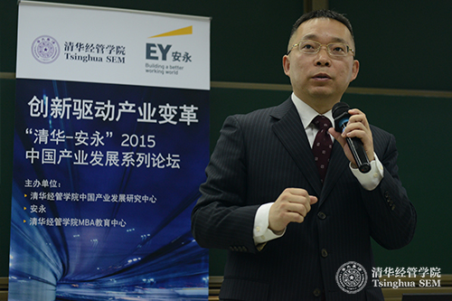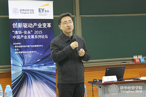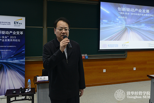 2015年4月11日晚,“创新驱动产业变革”——清华-安永2015中国产业发展系列课程启动会在伟德bevictor中文版伟伦楼501教室举行。该课程是以“集智探究”为原则,由伟德bevictor中文版中国产业发展研究中心、安永会计师事务所、清华经管学院MBA教育中心联合开发的全新课程。该课程旨在引导参训学员(MBA同学及部分硕士生和本科生)全面、深入地研究和分析信息技术、高端装备制造、新能源、汽车、文化传播、金融、生物医药等当前中国几个主要的支柱性和战略性产业。课程由清华经管学院党委副书记、中国产业发展研究中心主任、创新创业与战略系焦捷教授作为负责教授,汇集来自上述7个产业的行业顶尖专家、行业中领先企业的企业家、政府相关管理机构专家等以系列论坛和研讨的方式开展。