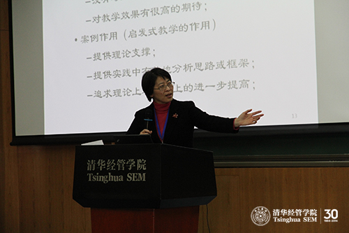 中国工商管理案例中心主任夏冬林教授首先致开幕词。之后,清华经管学院金融系陈涛涛教授做了题为“关于案例教学的几点体会”的演讲。陈涛涛教授强调,案例教学与知识讲授完全不同。案例教学作为一种特殊的授课方式,需根据不同类别学生的教学情境采取灵活而适应的举措,创造出互动讨论氛围以达到预期教学目标,使学生有所收获。