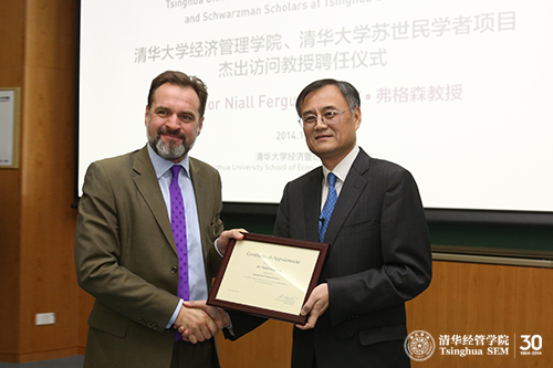 钱颖一院长为尼尔•弗格森(Niall Ferguson)教授颁发清华经管学院杰出访问教授聘书