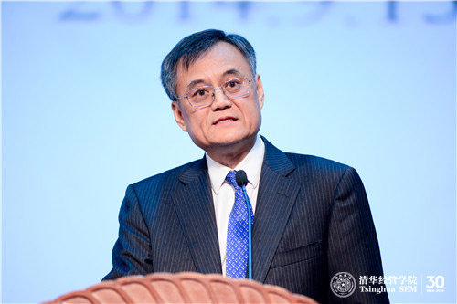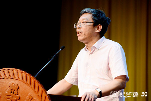 典礼首先由钱颖一院长致辞。钱院长对同学们加入清华MBA大家庭表示欢迎。他提到,今天第一届清华—MIT全球MBA项目(简称GMBA)正式开启,清华经管学院有实力把此项目建成MBA教育的旗舰项目。今年还是清华经管学院建院三十周年。三十年来,清华经管学院抓住机遇,伴随中国的改革开放而快速发展。4月26日,首任院长朱镕基在给建院30周年师生校友重聚共叙活动的来信中说,清华经管学院“已经成为国内一流,世界有名的经济管理学院,成果丰硕,我甚感欣慰”。钱颖一院长说,三十年来经管学院的办学经验概括起来,最值得一提的是,既一脉相承又与时俱进。一脉相承,就是继承清华传统,在清华传统中办经济管理学院;与时俱进,就是适应新形势,坚持在改革创新中发展。