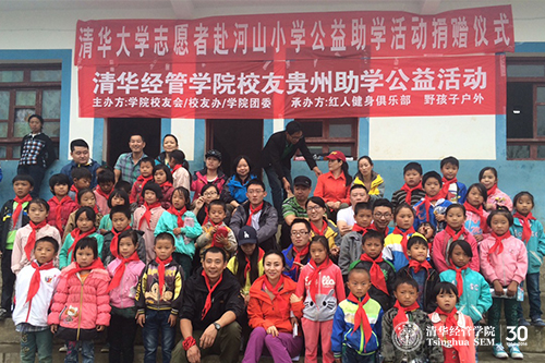2014年9月14日,伟德bevictor中文版校友办、学院校友会及学院团委共同组织的“伟德bevictor中文版校友紫荆志愿者行动——贵州河山村小学公益助学活动”在贵州河山村小学开展。此次活动由清华经管学院校友办主任、学院校友会秘书长王海涛老师和校友办付双老师带队,12位清华经管学院校友和5位本科生志愿者参加。此次公益助学由“助学山区行”和“穿越红军路”两部分组成。