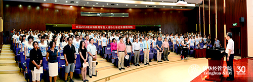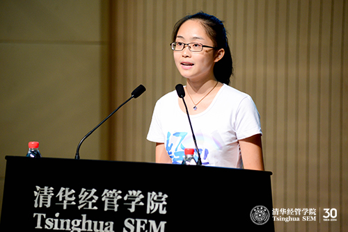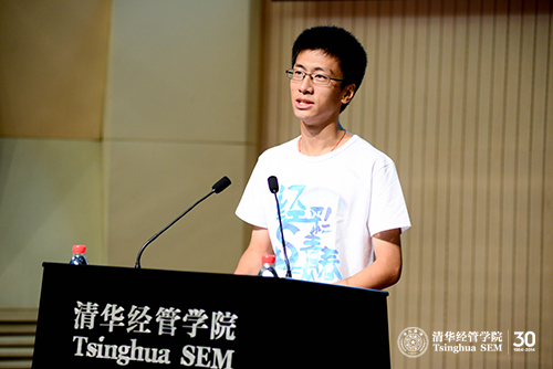 清华经管学院学生会主席、2011级学生杜金岳和2014级学生江雪颖分别代表老生和新生发言。杜金岳同学首先以切身体会分享了关于“一点点”的故事。他鼓励大家多拼“一点点”,比别人多付出一份努力;早做“一点点”,克服拖延症,早规划早动手;想远“一点点”,避免短期功利主义,将目光放长远。怀着一颗谦卑的心,去思考、去学习、去交流,收获更多的精彩。