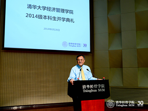 钱颖一院长在致辞中首先祝贺同学们在清华经管学院建院30周年之际以优异成绩成为学院的本科生。今年是钱颖一教授担任清华经管学院院长之后连续第八年致辞本科新生。钱院长在每年的开学典礼讲话中都有一个主题。2012年开学典礼的讲话主题是知识的“有用”与“无用”,是讲“学什么”。2013年开学典礼的讲话主题是“学好”与“好学”,是讲“如何学”。今年开学典礼的讲话主题是“人”与“才”,不是讲“人才”培养,而是讲“人”的培养,讲人的“价值”。