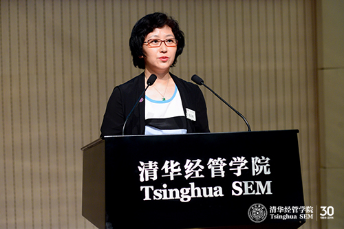 中国机械工业集团有限公司资产财务部长杨鸿雁(2014级)作为新生代表发言。她回顾了自己的工作经历,分享了她选择金融财务MBA的动机,即“看得懂,想明白,有作为”。她希望跟随各位导师、学长的脚步快乐地行走在思想的前端、理论的前端、实践的前端,完成职业生涯的转身和蜕变。