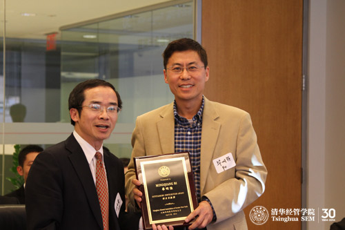 此次聚会在纽约第五大道的Trump Tower举办,由毕明强(经1990/经硕1995)校友所在的中国工商银行(美国)友情提供场地支持,文兵(经1988/经硕1993)校友担任主持人。活动一开始,播放了清华经管学院党委书记杨斌教授对纽约校友的思念和祝福,这段视频迅速把大家的思绪带回了千里之外的清华园。接着,毕明强校友致开场辞,深情回忆了他在学院的学习生活,提到了学院从一个班,发展到今天成为清华的主要院系;从马杯乙组垫底,到甲组冠军常客,经历了天翻地覆的变化。说起学院对自己的影响和烙印,毕明强校友提到了当年李子奈老师对同学们的谆谆教诲,教导学生要有责任心和奉献精神,不仅要会做事,更要学会做人。大纽约地区清华校友会会长仰文奎则代表校友会为毕明强校友颁发了“杰出贡献奖”,以表彰他在美期间为清华校友活动做出的慷慨奉献。