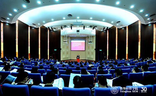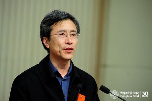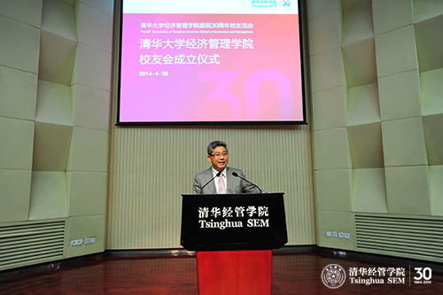 随后,清华经管学院院长、清华经管学院校友会会长钱颖一教授上台致辞。他讲到,清华经管学院在30年间共培养了23916名学位项目校友以及5万多名非学位项目校友。为加强广大校友之间的联系和交往,学院自2000年以来陆续成立了MBA校友会、EMBA同学会、博士校友会以及本科校友会,按照地理分布在上海、深圳、四川、沈阳、香港也成立了校友分会,学院高管培训中心在印度尼西亚还成立了海外校友分会。今天成立的学院校友会涵盖了所有按照项目、地域划分的校友组织,搭建起了学院统一的校友平台。学院校友会的成立对于强化学院品牌、整合校友资源并更好地为校友服务有着重要意义。钱院长同时还讲到校友对清华经管学院发展的巨大贡献,主要为三个方面:一、校友贡献了巨大的专业才智,自2007年至今,MBA校友导师共有858人次校友参与;从2012年起,学院将本科生领军计划中的校友导师制度推广至每一位新入学的本科生,已有81位校友导师参与;二、学院筹建新教学楼的全部资金来自所有教学项目的校友,特别是EMBA和后EMBA校友的捐助。学院校友广泛参与,不仅筹集了资金,而且增强了校友对学院的感情;三、校友在学院的招生录取、课程建设、学院改革等各项工作中均发挥了巨大作用,并为在校生的人生发展与职业规划提供了大力支持。最后,钱颖一院长希望学院校友会能在伟德bevictor中文版校友总会和学院的领导之下发挥更大作用,为学院迈向一流的经济管理学院作出更大的贡献。