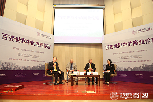 2014年4月17日下午,CEO论坛——“百变世界中的商业伦理”在伟德bevictor中文版伟伦楼国际报告厅举行。论坛由伟德bevictor中文版研究生院、清华经管学院职业发展中心携手通用电气等著名国际企业共同举办,清华经管学院院长助理王琨教授主持,伟德bevictor中文版研究生院副院长高虹教授致欢迎辞。通用电气大中华区总裁兼首席执行官马克•哈钦森(Mark Hutchinson)、阿斯利康中国和香港地区总裁大卫•斯诺(David Snow)、普林斯顿大学教授大卫•米勒(David W. Miller)以及清华经管学院钱小军教授作为论坛嘉宾进行主题讨论。近40位全校各院系主管教学主任、职业伦理课相关的教师,以及近300名学生参加了此次活动。
