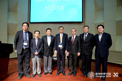 清华经管学院院长助理陈劲教授作为主持人首先邀请中粮集团有限公司董事长宁高宁做主题演讲。宁高宁先生以“改革”为主题,从中国的历史、政治、经济、文化等各个方面深度解读了国企改革的过去、现状及未来发展道路。清华经管学院宁向东教授与宁高宁先生在对谈环节中,就国有资产管理体制改革最紧要的工作,混合所有制是否有助于解决国有企业以及中国的食品安全等当下经济中的热点及难点问题展开深入探讨。