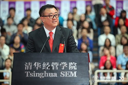 清华经管学院院长钱颖一在讲话中介绍了建院30周年四个重点系列的活动,向全院教职员工,在学院各个发展阶段作出奉献的老领导、老教师、老员工,学校领导、各部门、各院系,社会各界和学院顾问委员会致以诚挚的谢意。钱颖一特别回顾了朱镕基老院长30年来对学院发展的指导和关怀,并向他致以崇高敬意。