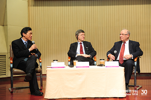 论坛由三部分组成,第一场圆桌讨论,清华经管学院弗里曼讲席教授、中国与世界经济研究中心主任李稻葵与著名经济学家、“休克疗法”之父Jeffrey Sachs,摩根大通国际董事长Dr.Jacob A.Frenkel,针对可持续发展和教育体制改革问题进行了深入探讨。第二部分是学术演讲,国家外汇管理局中央外汇业务中心主任殷勇先生就中国债务可持续性问题做了演讲,清华经管学院金融系宋逢明教授就中国银行业的改革和人才需求这一话题分享了独特的见解和研究成果。第三部分的圆桌讨论围绕国内外的宏观经济形势展开,就怎样有效提升资源配置展开对话。圆桌讨论由清华经管学院金融系何平教授主持,讨论嘉宾分别为美联储高级经济师李灿林先生、高瓴天成投资咨询有限公司董事总经理洪婧女士和清华经管学院金融系朱武祥教授。