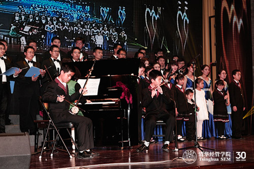 回首30年,清华经管学院及MBA项目的发展历程成为今年晚会的主旋律。《行进光影中的清华经管MBA》开场影像秀,以震撼的开篇气势,拉开了“回首30年”的主题序幕。清华经管MBA合唱团的大合唱《夜空中最亮的星》,歌声悠扬清越,引人遐想;MBA2013级P3班同学自编自导自演的舞台剧《爱是永恒》,情真意切地表现了MBA学生入校、创业、恋爱的典型人生片段与群体缩影;MBA2013级I班以乐队结合劲舞的形式炫出《最爱混搭》的激情,凸显国际MBA学生的风采;MBA2013级F1班的话剧《我们的意见生活》以童话式的拟人手法和特写的方式,记述了MBA学习生活艰辛中充满欢乐的别样情调;分别由MBA2013级F2班和P2班同学表演的舞蹈串烧《青春生活》和瑜伽秀《知行合一》,生动展现了MBA学生充满人文气息的多彩生活;由盲童小朋友与清华经管MBA合唱团等共同演唱的歌曲《HOLY NIGHT》,表现了MBA学生大爱无疆的公益情怀。